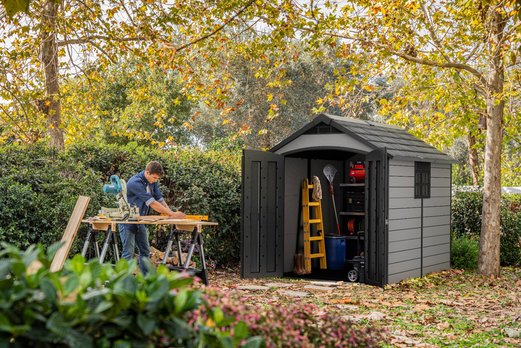Do domku lze snadno umístit nejen nářadí, ale také zahradní nábytek, květináče a sezónní vybavení. Jeho funkční interiér umožňuje pohodlný pohyb a přizpůsobení uspořádání vlastním potřebám.
