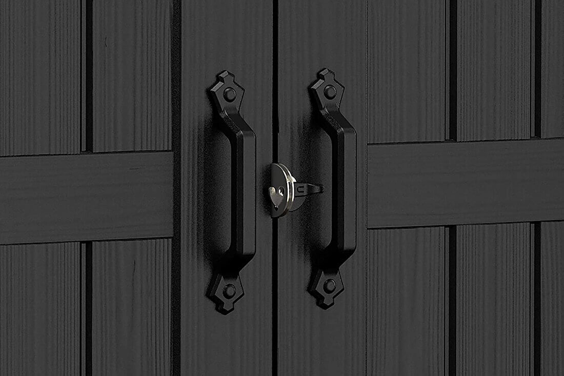 Dveře vybavené místem pro visací zámek umožňují zabezpečit interiér proti neoprávněnému přístupu – pohodlné a funkční řešení pro uložení cenného nářadí nebo zahradní techniky.