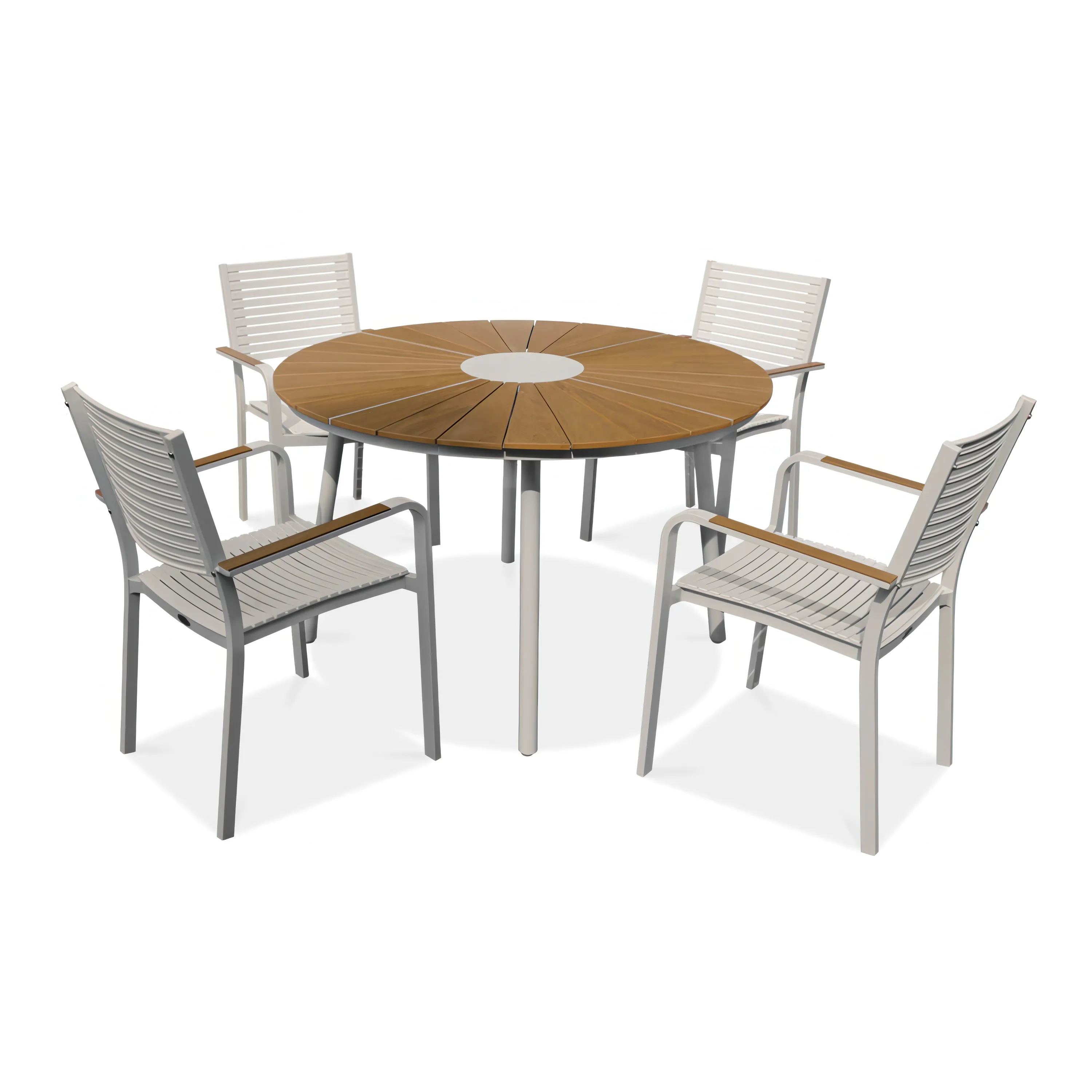 Objevte pohodlí a výjimečný design v zahradním jídelním setu TACOMA Fi120/4+1 White od společnosti Focus Garden. Tato exkluzivní souprava nejen zvýrazní kouzlo vaší zahrady, ale také poskytne nezapomenutelný zážitek při letních venkovních setkáních. Čtyři elegantní židle a robustní stůl v sobě spojují materiály nejvyšší kvality a precizní zpracování. Jejich hliníková konstrukce, práškově lakovaná čistou, zářivě bílou barvou, zajišťuje nejen odolnost, ale také lehkost a eleganci a harmonicky splývá s okolím. Pohodlí při používání je další předností této soupravy. Židle s plastovým sedákem a opěradlem zajišťují pohodlí i při dlouhých venkovních setkáních, zatímco područky z polywoodového dřeva v teplém odstínu teaku dodávají luxusní nádech navíc jsou židle stohovatelné (vkládají se jedna do druhé). Robustní hliníková noha stolu zaručuje stabilitu a bezpečnost při jakémkoli jídle nebo jednání, zatímco deska z polywoodového dřeva v barvě teaku dodává eleganci a prestiž. Odolnost a funkčnost jsou klíčovými vlastnostmi této soupravy. Díky robustní konstrukci a vysoce kvalitním materiálům je souprava odolná vůči povětrnostním vlivům, což jí umožňuje užívat si ji po mnoho sezón. Desky z polywoodového dřeva se snadno čistí a jsou odolné vůči povětrnostním vlivům, takže jsou praktické a snadno se používají. Investujte do zahradního jídelního setu TACOMA Fi120/4+1 White a vytvořte si na své zahradě jedinečné místo pro odpočinek a setkávání. Nechte se unést jeho propracovaným designem a nezapomenutelným zážitkem, který vám poskytne nejen jeho estetika, ale také funkčnost a pohodlí.Vlastnosti výrobku