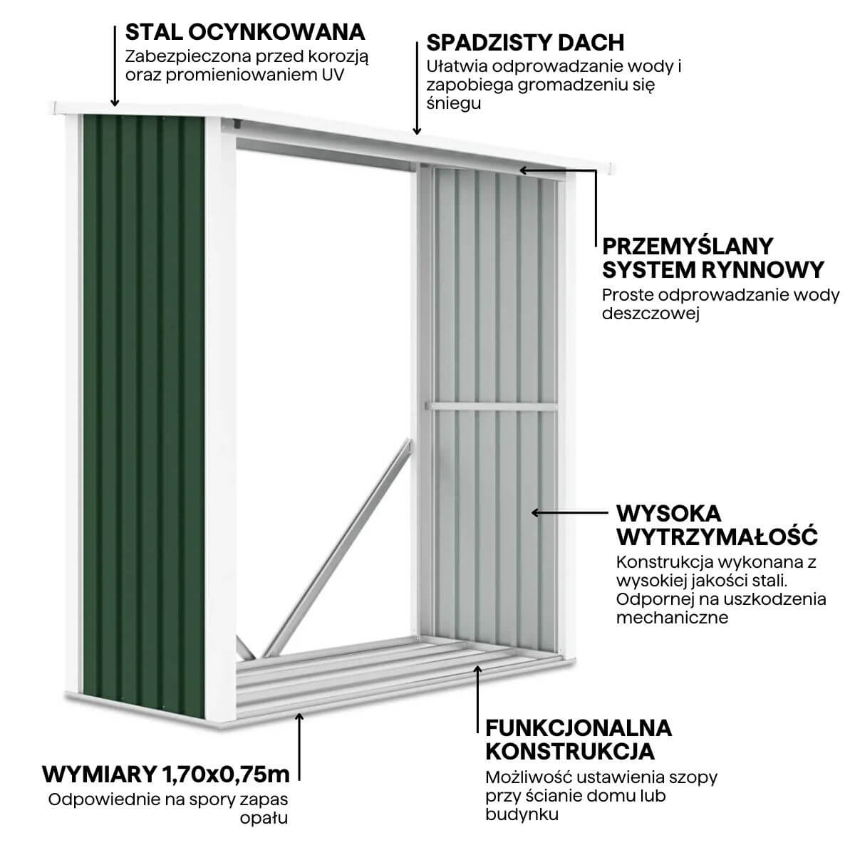 Přístřešek na nářadí Denver je ideálním řešením pro ty, kteří oceňují funkčnost a styl při organizaci svého zahradního prostoru. Robustní konstrukce s ocelovým rámem a kovovými panely zajišťuje odolnost proti poškození a nepříznivým povětrnostním podmínkám. Přístřešek vybavený okapovým systémem účinně odvádí vodu a chrání dřevo před vlhkostí. Jeho elegantní zelené barevné provedení dokonale zapadne do estetiky každé zahrady.