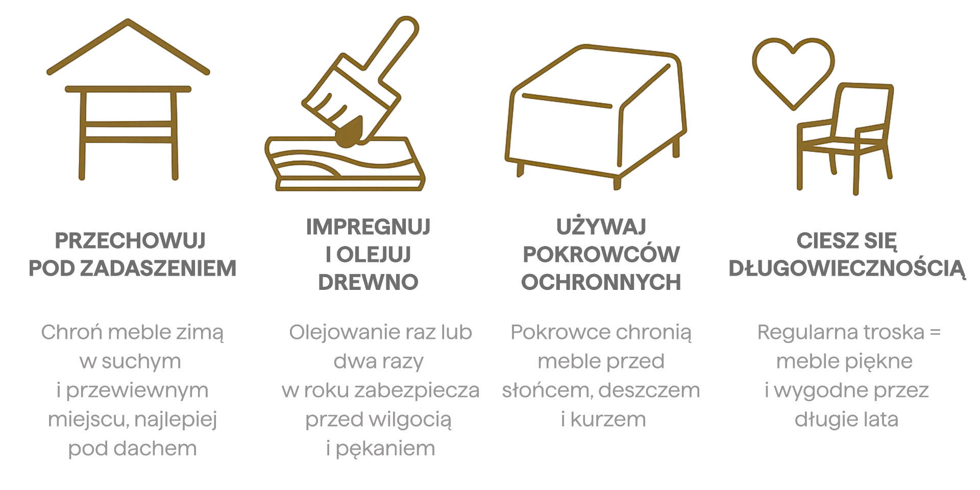 Během podzimu a zimy skladujte nábytek na suchém a vzdušném místě pod stříškou, abyste minimalizovali vliv vlhkosti, mrazu a měnících se povětrnostních podmínek.