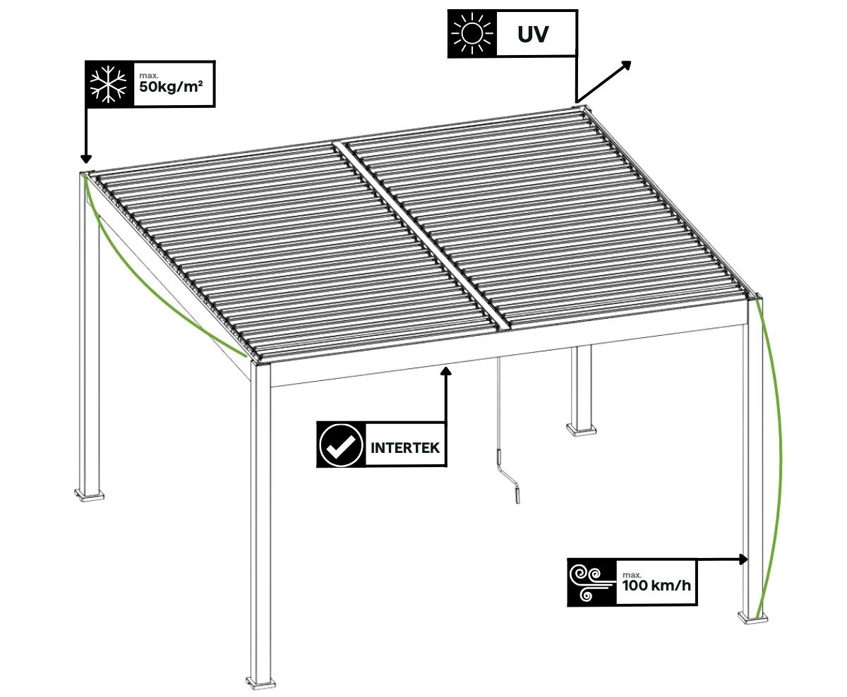 Pergola se vyznačuje robustní konstrukcí, která je navržena pro spolehlivost v náročných povětrnostních podmínkách. Zaručuje stabilitu při větru o rychlosti až 100 km/h a střecha odolá zatížení sněhem až 50 kg/m². Vyrobení z práškově lakovaného hliníku zajišťuje odolnost proti UV záření a korozi, což chrání materiál před poškozením a vyblednutím. Vysokou kvalitu a bezpečnost výrobku potvrzuje certifikát Intertek.