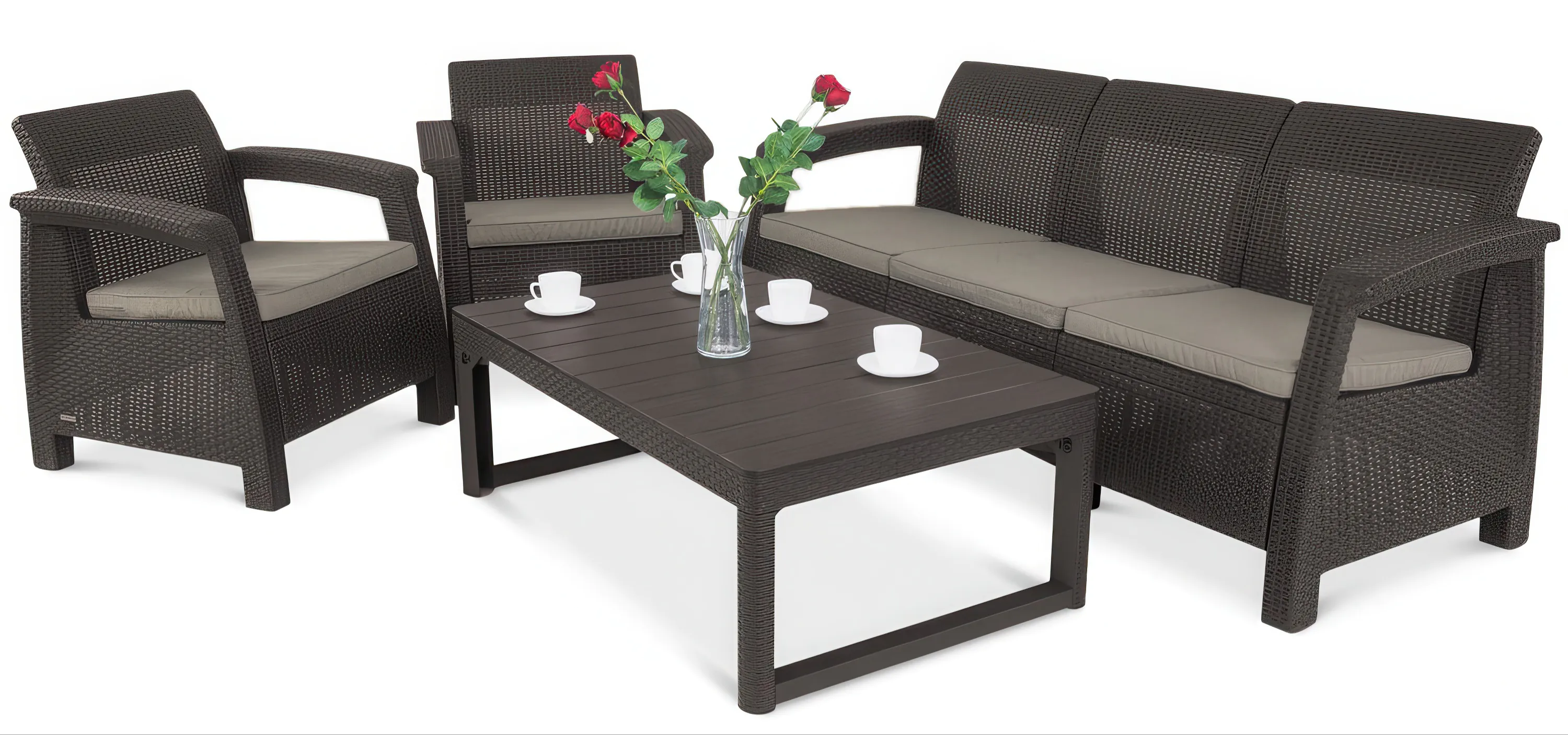 - celá souprava je vyrobena z vysoce kvalitního polypropylenu v hnědém odstínu s přírodní ratanovou strukturou, RATTANOVÝ EFEKT!