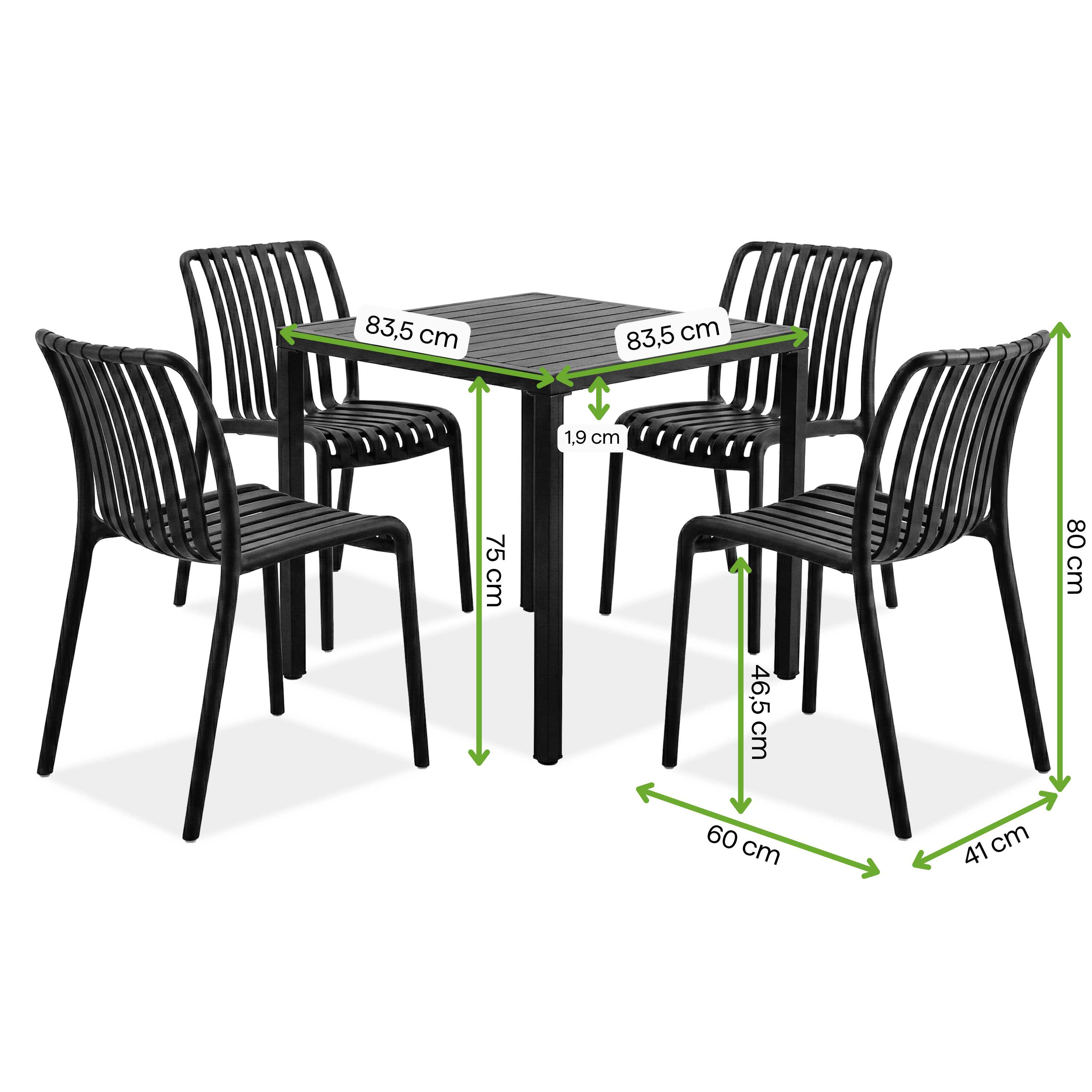 Minimalistický tvar a černé barevné provedení se hodí k moderním terasám, zahradám a komerčním prostorám a soupravu lze snadno sladit s různými designovými styly.