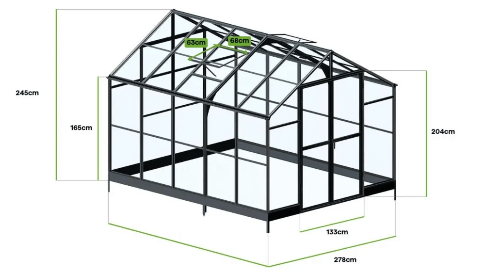- Zasklení z 2 mm pevného polykarbonátu – materiálu, který je odolný vůči povětrnostním vlivům a navíc poskytuje vynikající propustnost světla, vytváří ideální podmínky pro růst rostlin. -