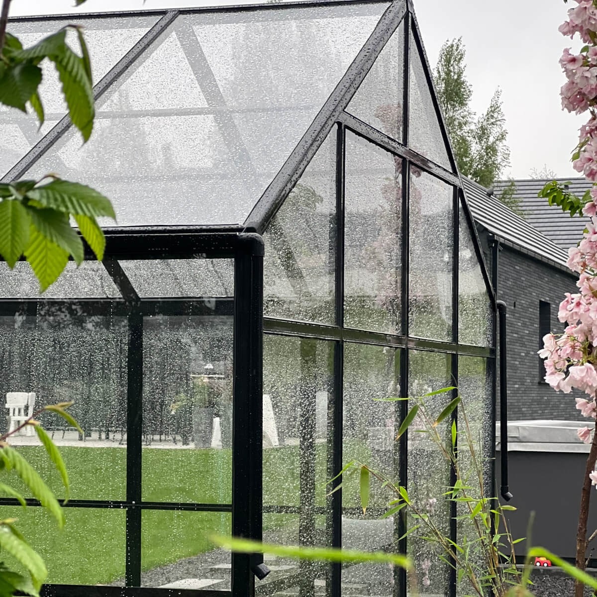 - Zabudovaný okapový systém se čtyřmi hliníkovými svody efektivně odvádí dešťovou vodu, chrání skleník a umožňuje její využití například k zalévání zahrady.
