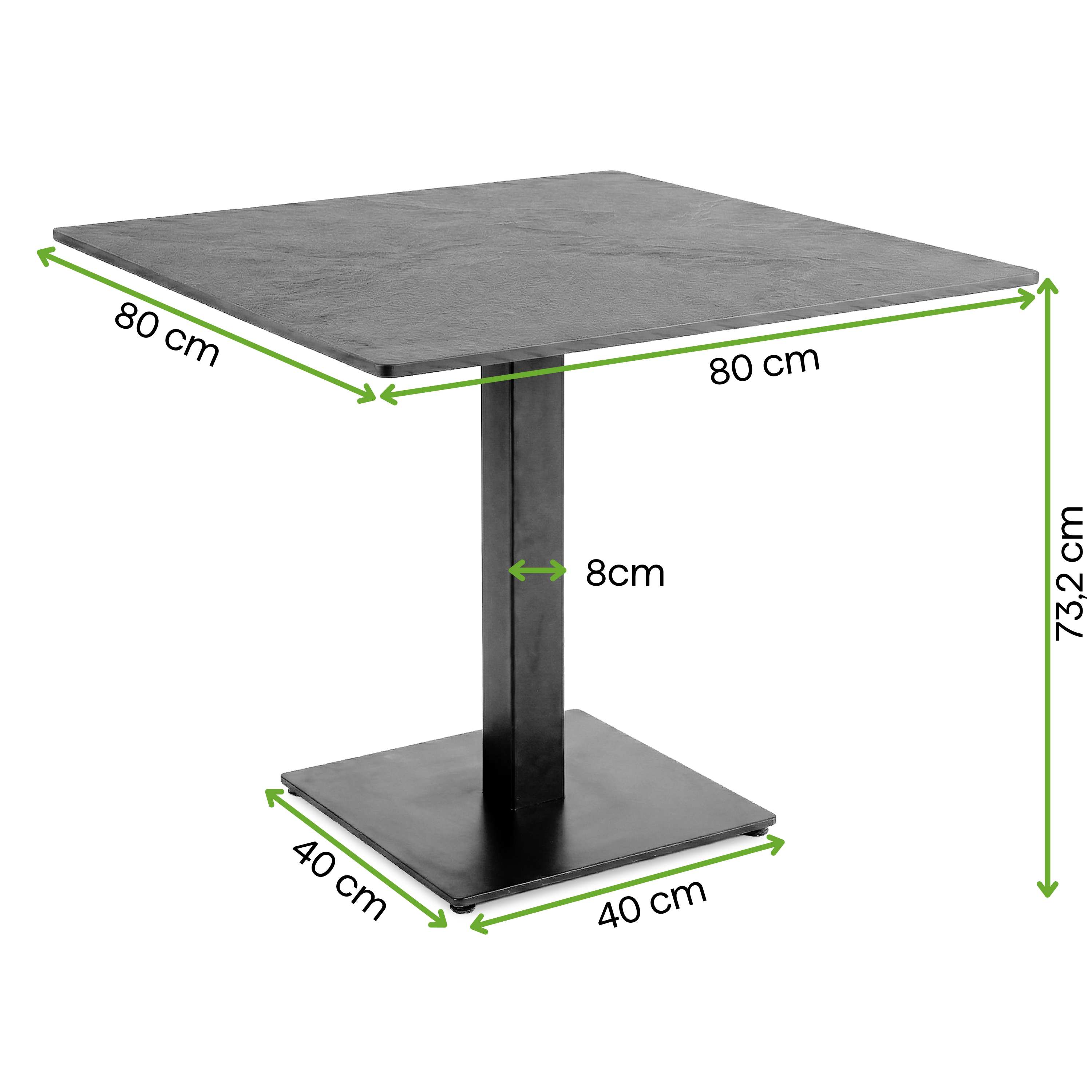 Zahradní stůl s ocelovou podnoží RIVIO/VENA 80 cm - Bjørkka v sobě spojuje moderní tvar, odolnost a materiály určené pro intenzivní venkovní použití. Robustní podnož RIVIO BLACK ze silnostěnné oceli, chráněná elektronickým lakováním v pískově černé barvě, poskytuje vysokou odolnost proti povětrnostním vlivům a korozi a bezpečnou oporu pro desku stolu s nosností až 25 kg. Doplňuje ji deska VENA 80 ANTHRACITE MARBLE z kompaktního laminátu HPL, která se vyznačuje odolností proti poškrábání, nárazům, oděru, vlhkosti a UV záření a dlouhodobě zachovává hloubku barvy antracitového mramoru. Celek vytváří estetický stůl se snadnou údržbou, ideální pro zahrady, terasy a komerční prostory, jako jsou restaurace, školy nebo veřejná zařízení.