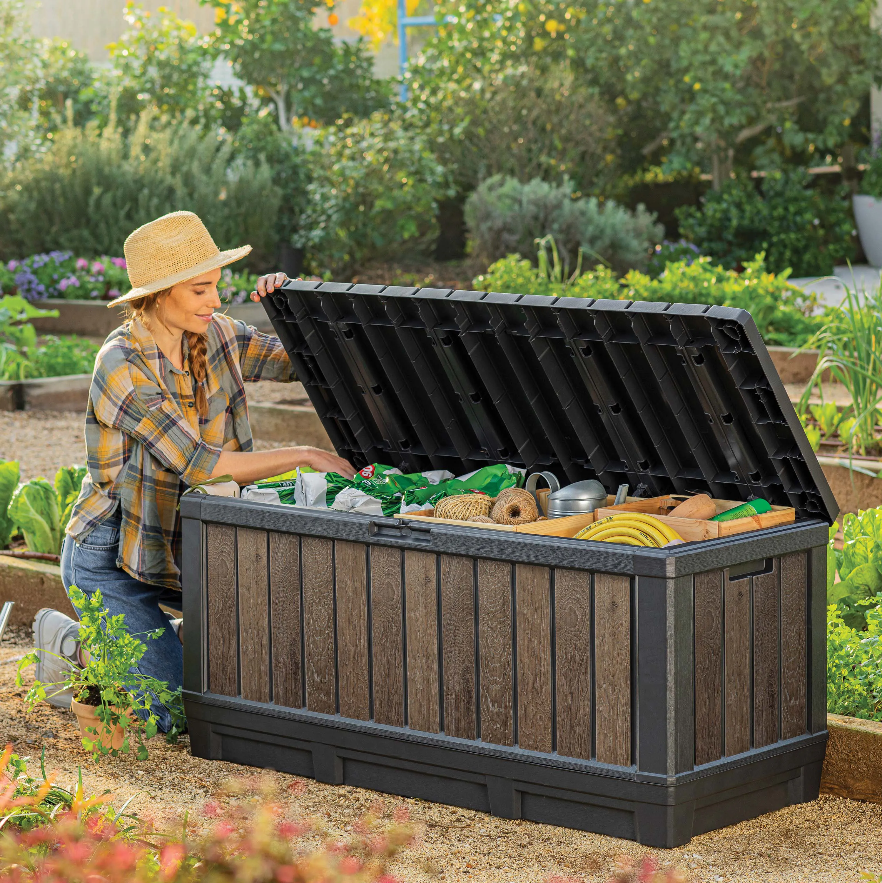 Zahradní úložný box DECO KENTWOOD 350L Walnut od společnosti Keter je praktický zahradní box o objemu 350 litrů, který pomáhá udržovat pořádek na terase, balkoně nebo zahradě a nabízí prostor pro polštáře, deky, zahradní doplňky a drobný nábytek. Box je vyroben technologií Decocoat, která kombinuje odolnost plastu s elegantní povrchovou úpravou s přírodní kresbou dřeva, díky čemuž si zachovává estetický vzhled bez nutnosti údržby. Konstrukce odolná proti povětrnostním vlivům je vhodná pro každodenní venkovní použití a integrované rukojeti usnadňují přenášení. Navíc box umožňuje zabezpečení visacím zámkem (visací zámek není součástí balení), což zvyšuje ochranu uložených věcí.