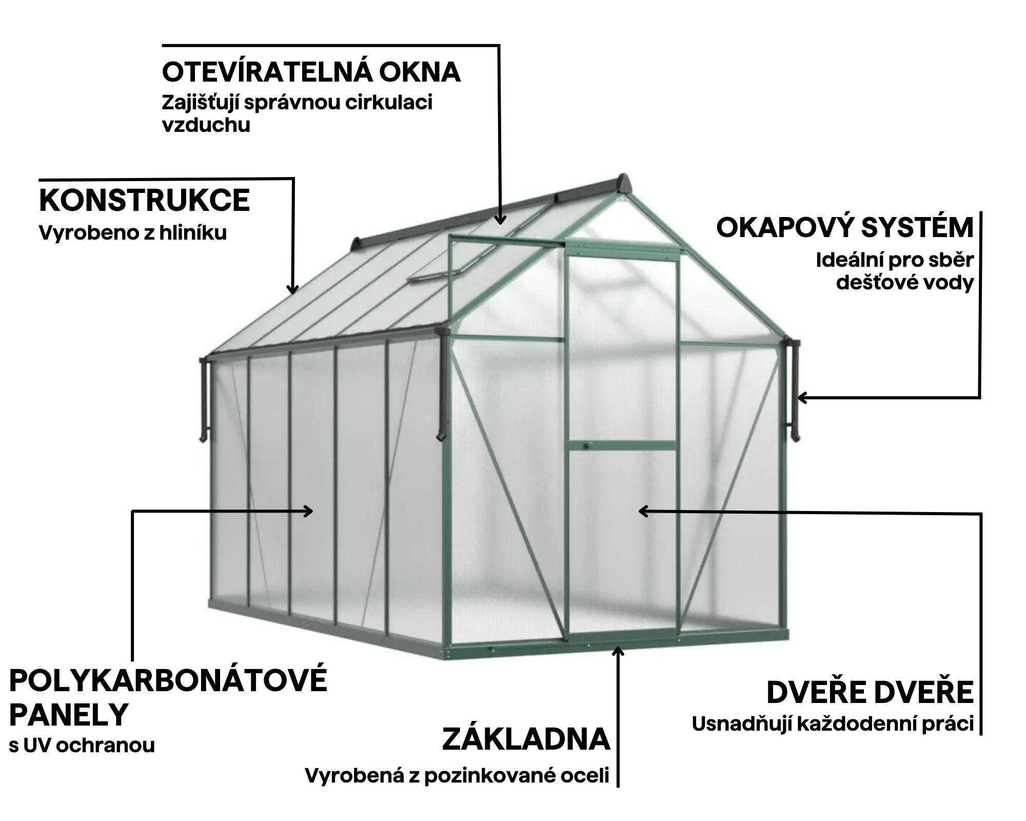 Antikorozní hliníková konstrukce je odolná vůči povětrnostním vlivům, což zaručuje dlouhodobé používání skleníku.
