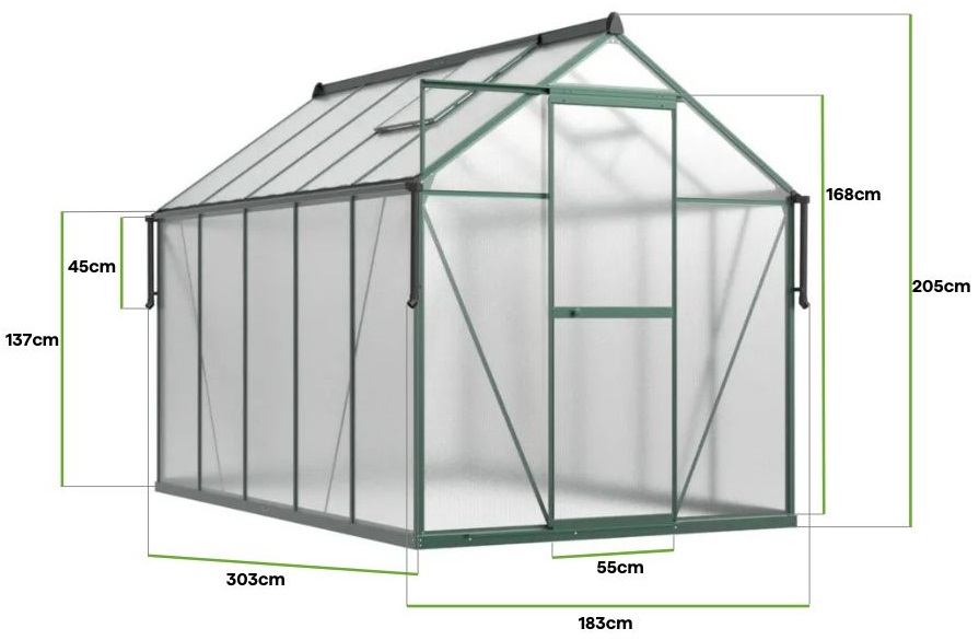 Zahradní skleník z polykarbonátu Slide-In NEW 183x303cm Dark Green od Cultivo s vyztuženou konstrukcí je kombinací klasického stylu a moderní funkčnosti. Tmavě zelená konstrukce dokonale zapadá do přirozeného prostředí zahrady a vytváří harmonický prostor pro pěstování rostlin. Díky délce 303 cm nabízí skleník ještě více prostoru, který je ideální pro pěstování zeleniny, ovoce, bylinek nebo květin. Polykarbonátové panely o tloušťce 4 mm s UV ochranou zajišťují rostlinám optimální podmínky pro růst, účinně rozptylují sluneční světlo a chrání před jeho nadměrným působením. Stabilní rám z hliníku a pozinkovaná ocelová základna zaručují pevnost a odolnost vůči proměnlivým povětrnostním podmínkám. Montáž je rychlá a jednoduchá díky inovativnímu systému Slide-In, který eliminuje nutnost použití sponek a zajišťuje větší stabilitu a snadné použití. Dvě ventilační okna a posuvné dveře zaručují pohodlný přístup a účinné větrání, což umožňuje vytvořit ideální mikroklima pro vaše plodiny. Polykarbonátová skleník dokonale doplní každou zahradu a dodá jí jedinečný charakter.