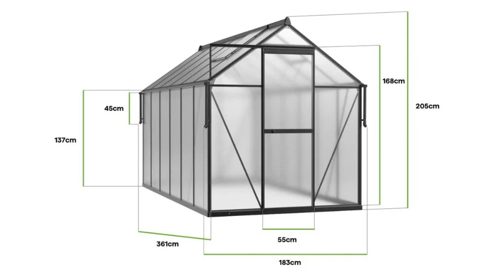 Polykarbonátová skleník Slide-In NEW 183x361cm Black značky Cultivo s vyztuženou konstrukcí je produkt, který posouvá pěstování rostlin na vyšší úroveň. Díky délce 361 cm nabízí tento model impozantní prostor, ideální pro pěstování nejrůznějších plodin – od zeleniny a ovoce po květiny nebo bylinky. Díky černému provedení se skleník stává nejen praktickým, ale také stylovým prvkem zahrady, který přitahuje pozornost. Polykarbonátové panely o tloušťce 4 mm, vybavené UV ochranou, zaručují správné rozptýlení světla a ochranu před škodlivým zářením, čímž zajišťují ideální podmínky pro růst rostlin. Odolný hliníkový rám a pozinkovaná ocelová základna zaručují, že skleník vydrží roky, bez ohledu na povětrnostní podmínky. Inovativní montážní systém Slide-In eliminuje nutnost použití sponek, což výrazně usnadňuje montáž a zvyšuje stabilitu konstrukce. Ve skleníku jsou zavedeny dvě vodorovné příčky, které zesilují konstrukci a výrazně zvyšují odolnost proti zatížení sněhem a působení větru. Dvě ventilační okna a posuvné dveře o rozměrech 168 x 55 cm zajišťují optimální proudění vzduchu a snadný přístup dovnitř. Zahradní skleník Slide-In NEW Black 183 x 361 cm je vynikající volbou jak pro začínající, tak pro zkušené zahradníky, kteří ocení prostornost, odolnost a styl.