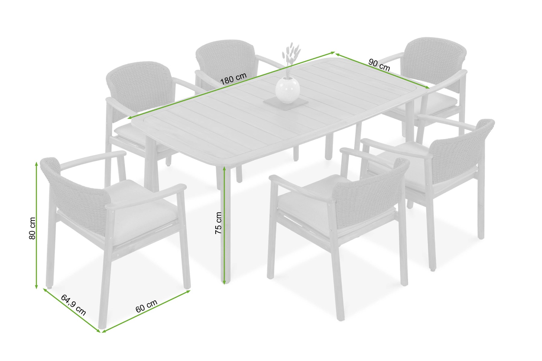 Jídelní set DOVER 6+1 od společnosti Furrore je elegantním a funkčním řešením pro zahradu nebo terasu. Skládá se z velkého 180 cm dlouhého stolu a šesti křesel s opěradly s kordovou opěrkou pro pohodlí a odolnost. Rámy židlí a stolu jsou vyrobeny z akáciového dřeva, které zaručuje stabilitu a odolnost vůči povětrnostním vlivům. Souprava kombinuje moderní design s přírodními materiály a vytváří příjemný prostor pro venkovní společné stolování.