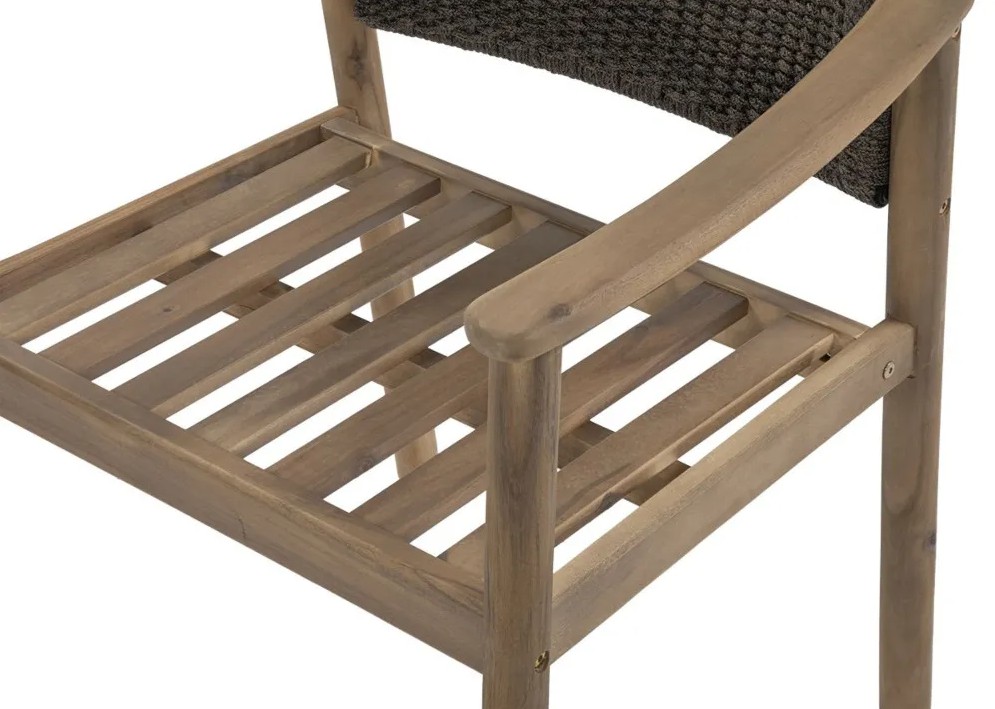 Konstrukce je vyrobena z masivního akátového dřeva, které je známé svou vysokou tvrdostí a odolností vůči venkovním podmínkám. Pečlivě sladěné komponenty, zesílené spoje a promyšlený tvar zajišťují stabilitu sedačky a trvanlivost použití po mnoho sezón.