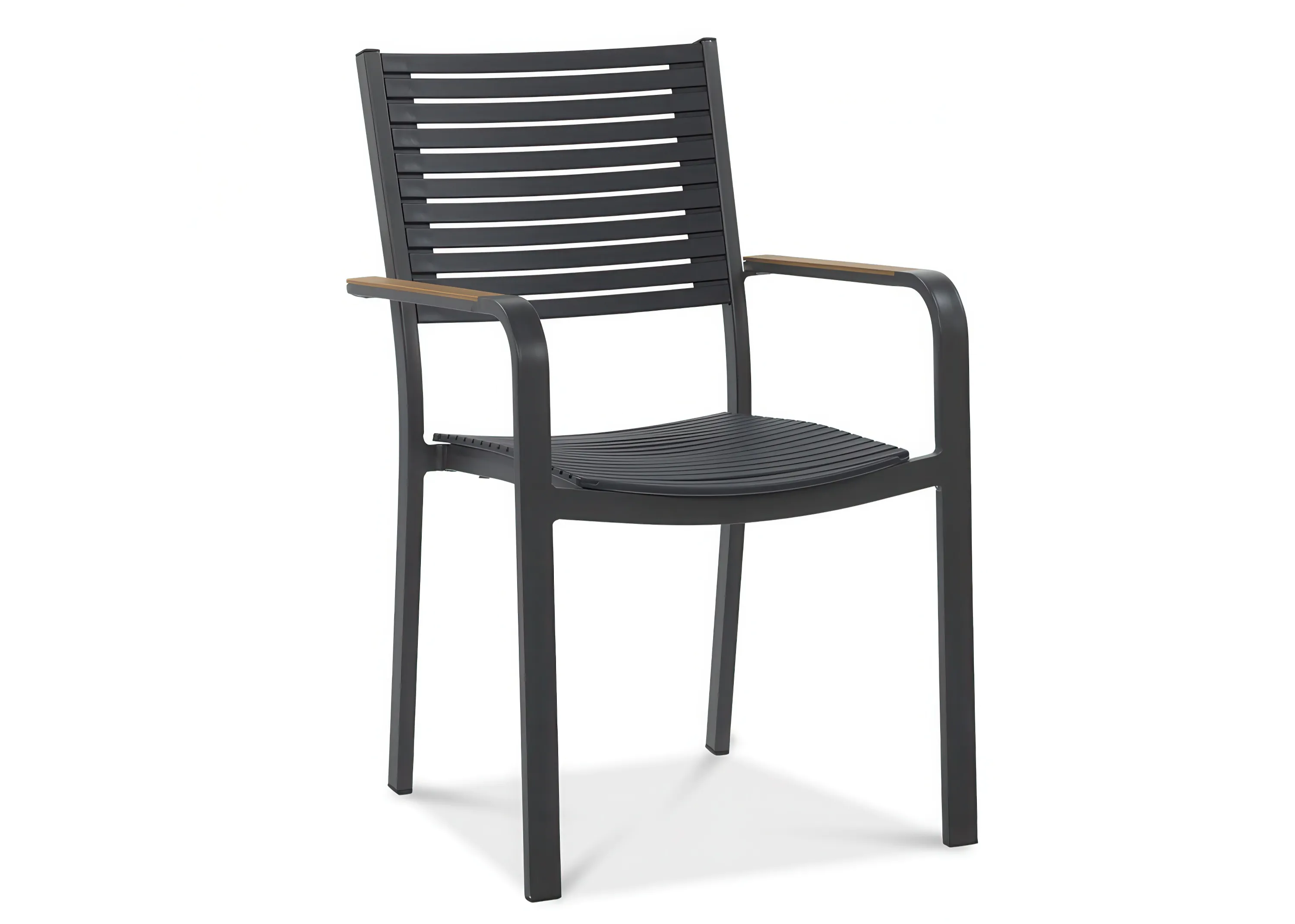 Objevte nadčasovou krásu v moderním pojetí - vyberte si židli Tacoma v elegantní grafitové barvě. Obohaťte svůj zahradní jídelní kout o praktický nábytek pro maximální pohodlí při lenošení. Tacoma je určena pro lidi, kteří chtějí trávit čas se svými blízkými venku ve stylovém a útulném prostředí. Zahradní židle Tacoma - odolnost, funkčnost, styl Zahradní židle Tacoma se skládá z lehkého a zároveň odolného hliníkového rámu s práškovou barvou v grafitové barvě. Sedák a opěradlo jsou naopak vyrobeny z odolného, vysoce kvalitního plastu. Opěradlo je opatřeno podélnými mezerami, které nejen zvyšují atraktivitu nábytku, ale také umožňují volný odtok vody. Židle Tacoma je venkovní kus nábytku, který je odolný vůči nepříznivým povětrnostním podmínkám - dešti, krupobití, nárazovému větru nebo intenzivnímu slunečnímu záření. Jeho velkou výhodou je také snadné čištění - stačí voda, hadřík a trocha čisticího prostředku. Pozornost věnujte také područkám s povrchovou úpravou z polywoodového dřeva v barvě teaku. Tento akcent připomínající dřevo dodává designu stylový a vkusný nádech. Křeslo Tacoma grafit - zpříjemněte si lenošení na zahradě Rádi trávíte čas se svými blízkými při společné oslavě jídla na zahradě? Zajistěte si pohodlí při posezení s křesly Tacoma! Jedná se o nábytek s pečlivě propracovanými proporcemi, takže ani po hodinách používání nebudete pociťovat nepohodlí. Vyberte si židle Tacoma v grafitové barvě s dřevěnými doplňky a dodejte svému prostoru elegantní výraz! Židle Tacoma nevrzají ani se neviklají - jsou to mimořádně stabilní a robustní výrobky, které vydrží mnoho sezón, a navíc jsou stohovatelné (vkládejte jednu do druhé). U Focus Garden najdete také praktické a stylové jídelní stoly na zahradu a hotové jídelní soupravy pro odpočinkovou zónu na dvoře. Prohlédněte si je všechny a zařiďte si prostor na míru svým potřebám!Vlastnosti výrobku